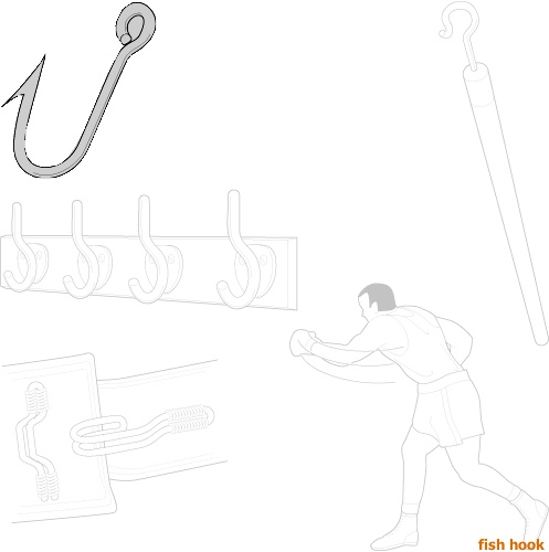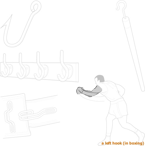 1. <A > a curved device used for catching or holding things, especially one fixed to a surface for hanging things on • a coat/picture hook • a boat hook • a fish hook See pictures , Thesaurus+: ↑Pins, clips, hooks and pegs